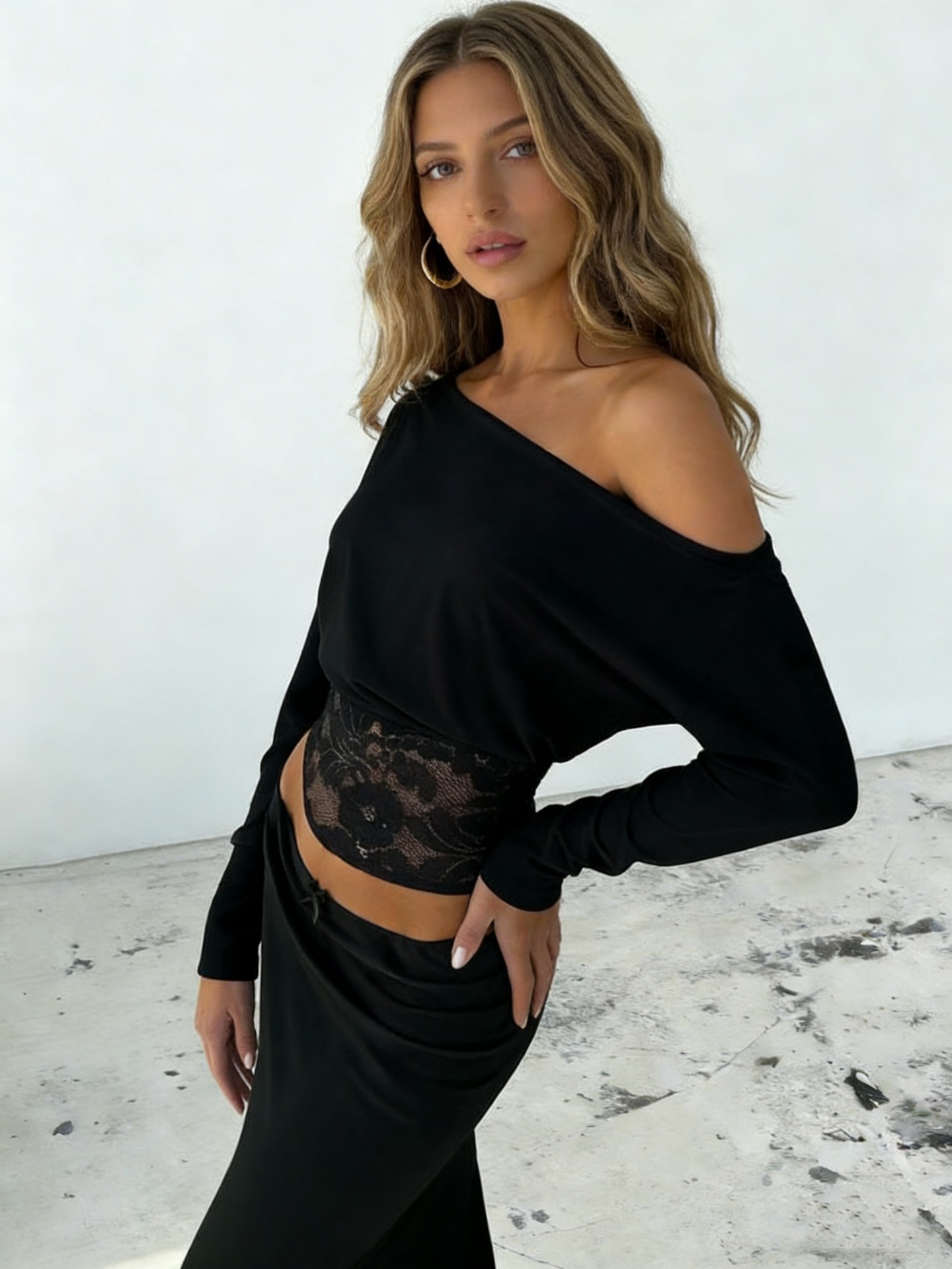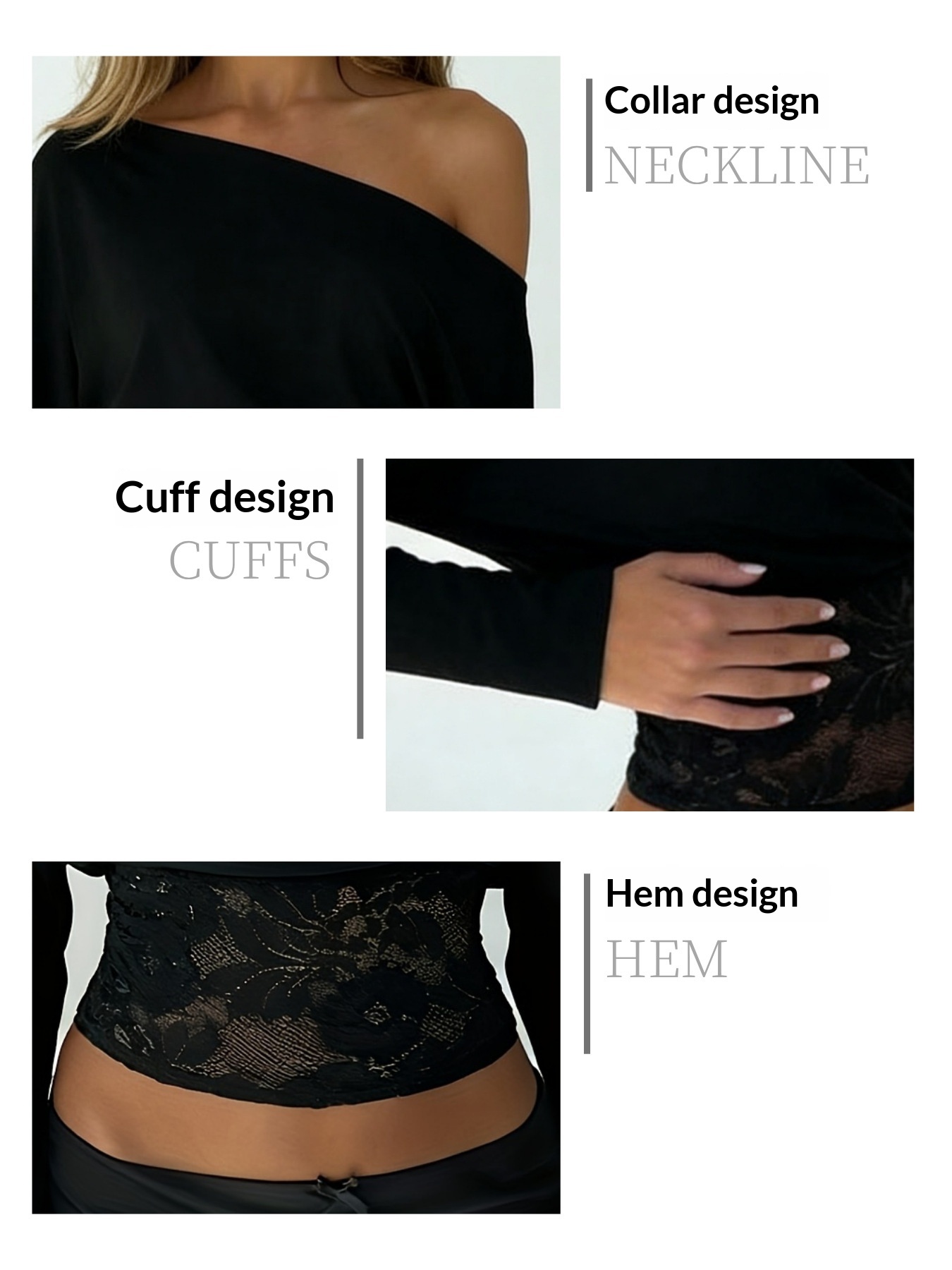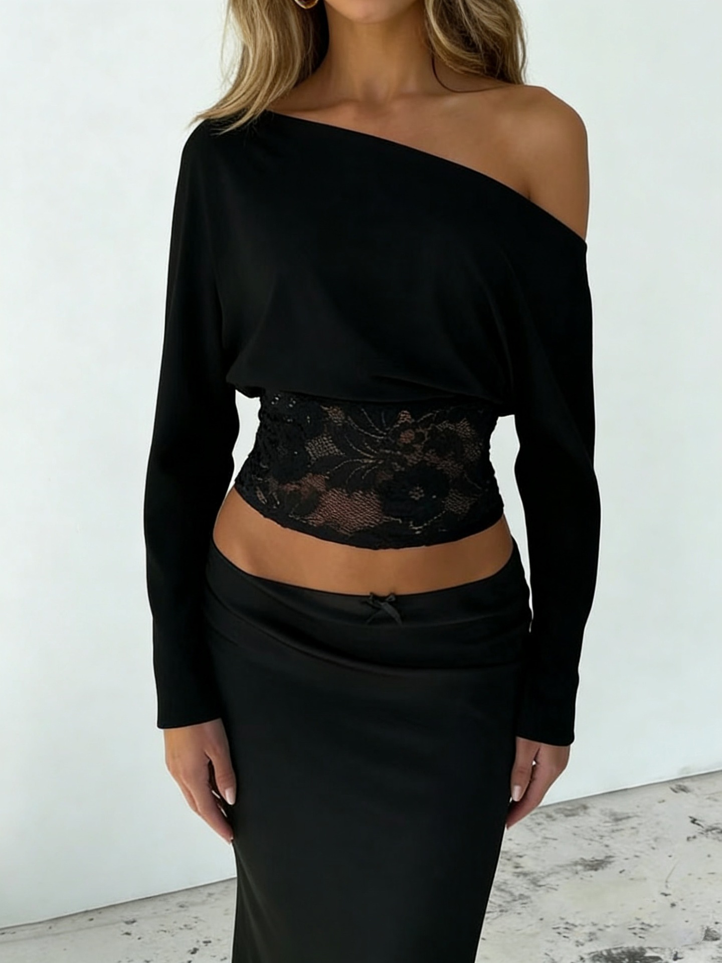 Womens Solid-Color Off-Shoulder Batwing Sleeve Lace-Patchwork Top